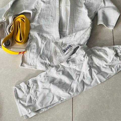 Lasten kamppailuasu, koko 134, väri valkoinen. Sopii erilaisiin kamppailulajeihin ja harjoitteluun. Materiaali ei ole määritelty.