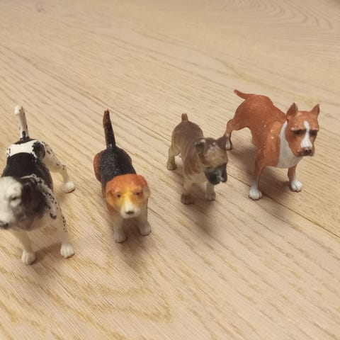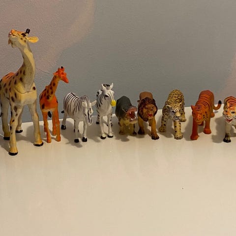 Myyn kaikki kuvien eläinfiguurit kerralla: maatilan eläimiä, Afrikan eläimiä, liskot ja matelijat sekä kaksi koirafiguuria. Figuurit ovat pieniä muutaman sentin kokoisia, koirafiguurit hieman isompia.