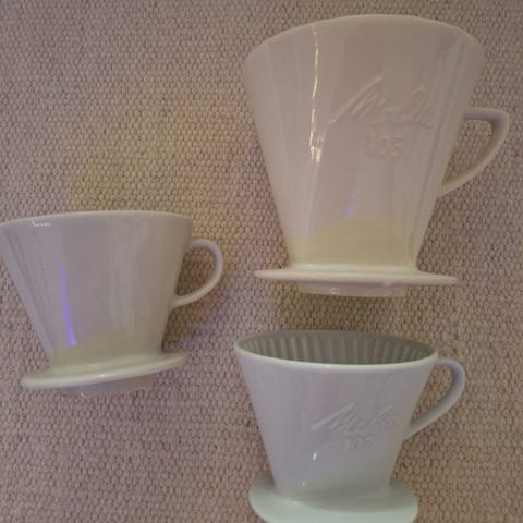 Kahvin Suodatin suppilo kannun tai kupin päälle, korkeus 8,5 cm ja halkaisija 10,5 cm, ehjä