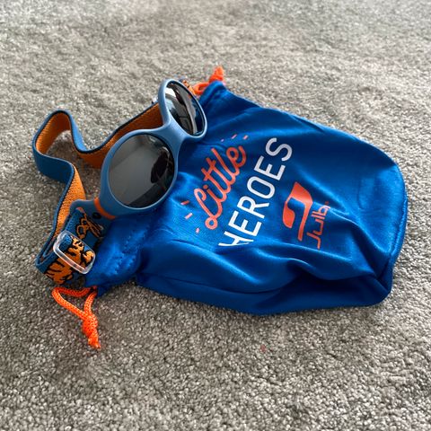 Siniset Julbo Loop M lasten aurinkolasit. Mukana sininen suojapussi ja niskaremmi. Olivat käytössä 1-1,5 vuotiaana. Voi käyttää molemmin päin ja aisat ovat joustavat, voi pitää pipon päällä tai alla eikä taivu lapsen käsittelyssä.