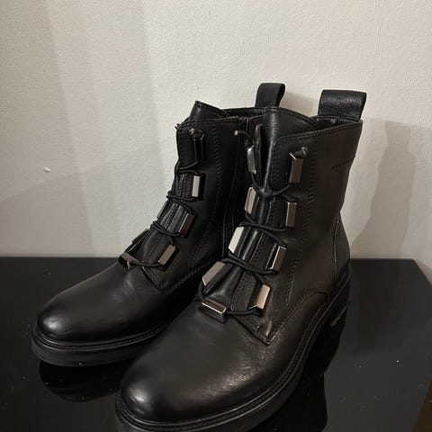 Mustat niittisomisteiset nahkasaappaat, sekä nauhat että vetoketju, korko n. 2 cm. Ollut käytössä kerran tai kaksi. Tyylikkäät maiharit talvikäyttöön, kevääseen tai kesän festareille.
