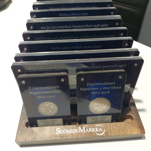 Suomen Tasavalta Markka -kolikkosarja. Sarja sisältää useita eri kokoisia kolikoita, jotka on suojattu läpinäkyvissä koteloissa.