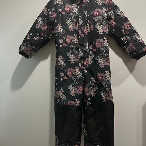 Lasten toppahaalari koossa 122. Merkki Mywear. Haalari on edelleen lämmin ja sisukset ovat kohtalaisen muhkeat. Pesty siis vain paristi. Vikoina haalarissa on hupun fleecevuorin nyppyisyys ja muutamat pienet viiltoreiät jotka ovat tulleet pikkukivistä. Polvissa kulumaa. Yhden reiän koitin kuvata, avain antamassa viitettä koosta. 7e.