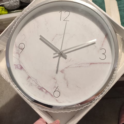 Seinäkello, jossa on marmorinen tausta ja kullanväriset roomalaiset numerot. Kellon koko on 20x20 cm. Kellossa on kolme viisaria: tunti-, minuuttija ja sekuntiviisari. Sopii seinälle ajan näyttämiseen.