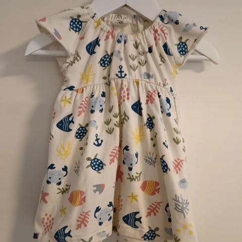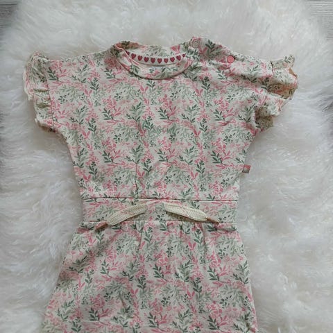 Vaaleanpunainen ehjä ja siisti mekko. Pupun, sateenkaaren, pilven ja kukkien kuvia. Olalla yksi nappi. Tullut meille uutena ja ollut käytössä vain muutaman kerran, hajusteeton pesu.