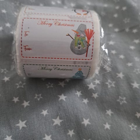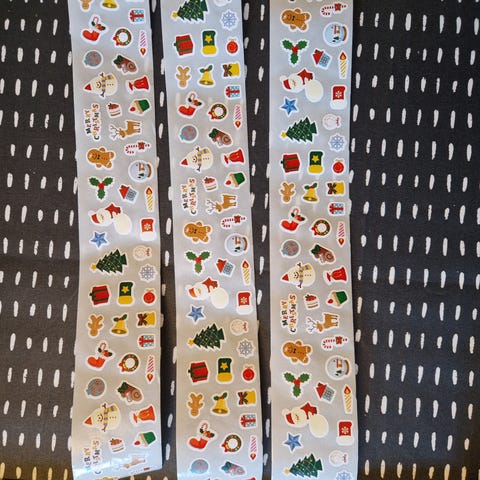 Koko noin 4x7,5 cm. Eri hahmoja tarroissa. Joululahja paketti tarroja. Nouto tai posti tuo jolloin ostaja maksaa postikulut.