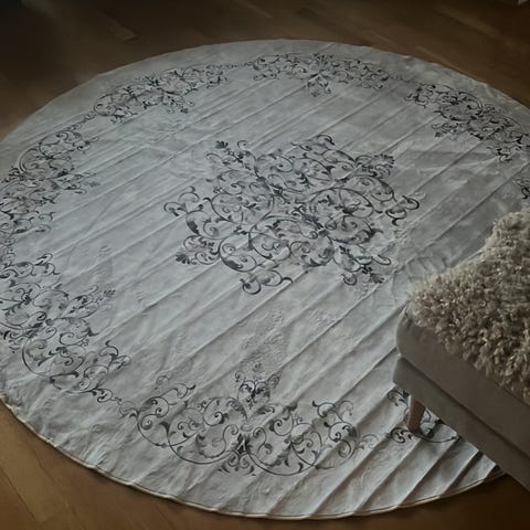 Pyöreä ryijynukkamatto, väri beige. Materiaali nukkamainen, sopii sisustukseen ja lattian peittämiseen.