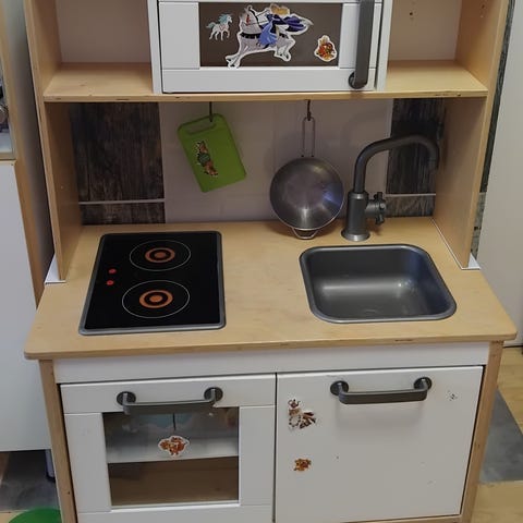 Lasten keittiö ja paljon eri oheistarvikkeita kuten kasviksia, pitsaa, ruokailuvälineitä. Hyvin vähäisellä käytöllä. Kuvassa oleva tyttö on 124 cm pitkä joten antaa mielikuvan sen koosta