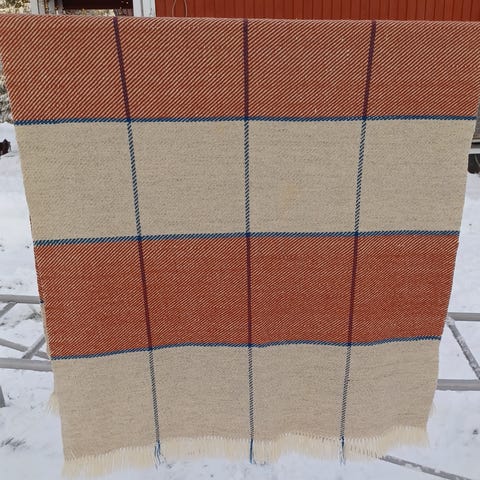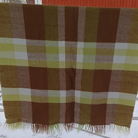 Kangaspuilla kudottu villasaali, jossa molemmin puolin samat värit. Koko 190c*100cm + hapsut. Kunto hyvä käytetty.