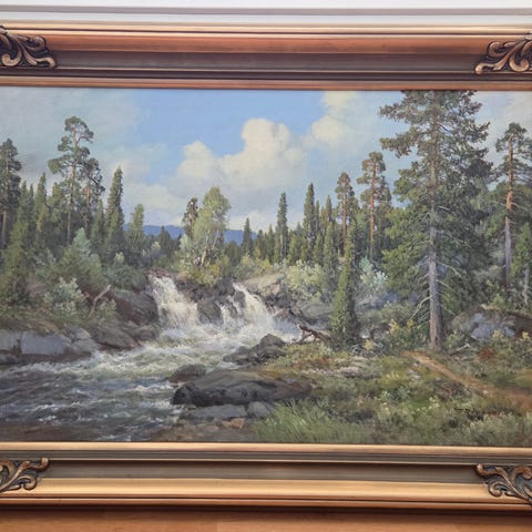 Taulun koko kehyksineen korkeus 63cm x leveys 83cm. Taulussa pieni lähes huomaamaton painauma vasemmalla puolella taulua keskellä.