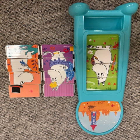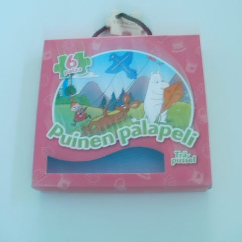 Martinexin Muumipalapeli. Paloja kasataan pidikkeeseen ja niistä muodostuu Muumipeikko, Niiskuneiti tai Muumipappa. Palojen reunoista värit hieman lähtenyt, näkyy kuvissa. Kaikki osat tallella.