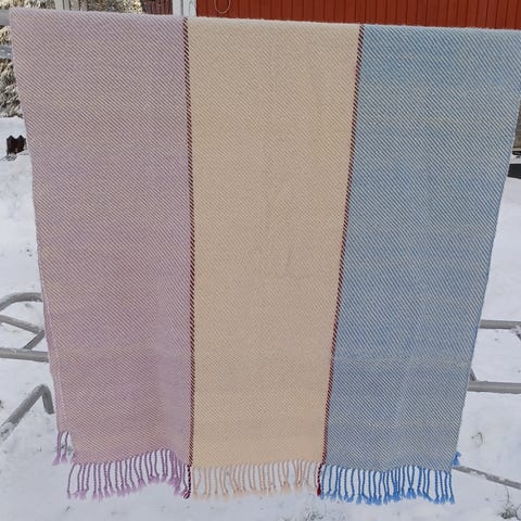Kangaspuilla kudottu villasaali, jossa molemmin puolin samat värit. Koko 165 cm*105cm + hapsut. Pesty, siisti peite. Kunto hyvä käytetty.