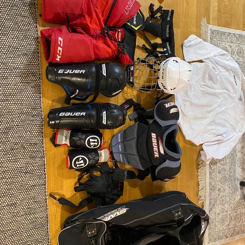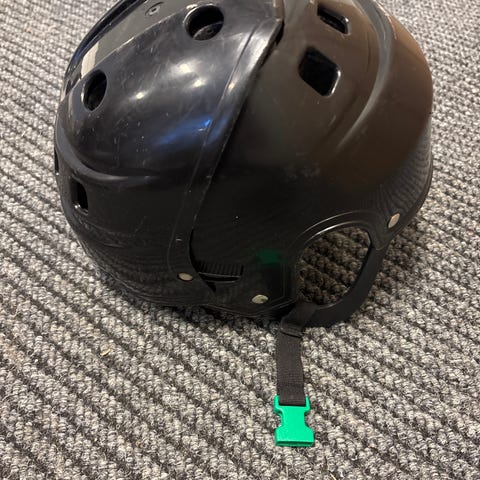 Jääkiekkokypärä. Muuten hyvä, mutta remmistä puuttuu toinen pää.