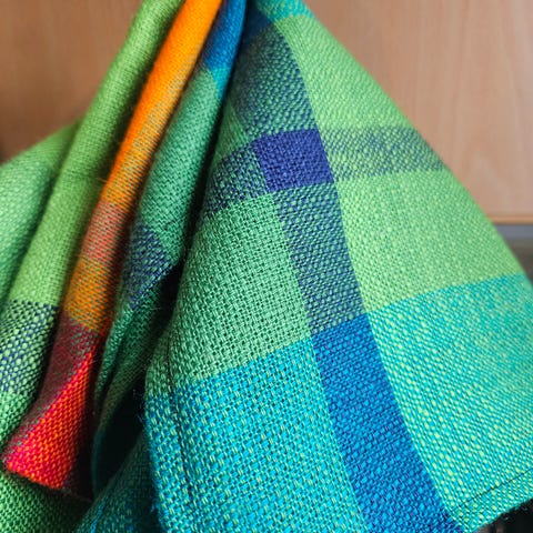 Hyväkuntoinen vintage pöytäliina jonka väritys näkyy parhaiten tuossa auringossa otetussa kuvassa