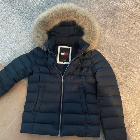 Tommy Hilfiger s-koon tum.sin lämmin untuvatakki, vetoketjutaskut ja irtohuppu jossa irtokarvareunus