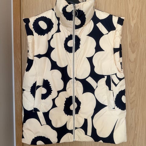 Marimekko Mika Piirainen liivi koossa M. On pienempää kokoa ja mennyt n. Xs-S koolla. Kai-kai n. 49cm ja olka-helma n. 54cm (edestä mitattuna, takaa on vähän pitempi). Tosi kiva, esim mustan poolopaidan kanssa sisätyössä, missä itse sitä käyttänyt.