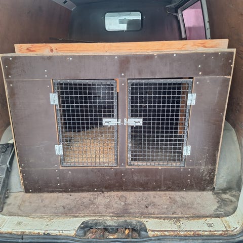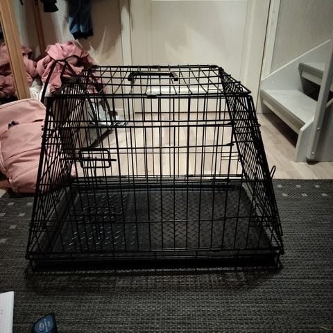 Muovinen koirankuljetuskoppa, jossa musta alaosa ja valkoinen yläosa. Etupuolella metallinen valkoinen ovi, joka suljetaan lukolla. Soveltuu pienten tai keskikokoisten koirien kuljetukseen.