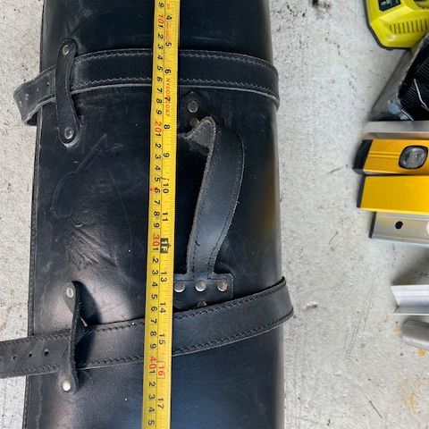 Moottoripyörälaukku, valmistettu mustasta nahasta. Laukussa on useita erikokoisia taskuja ja metalliset niitit koristeena. Kantokahva päällä ja lukittavat soljet. Sopii moottoripyörän tavaratilan laajentamiseen ja tarvikkeiden kuljettamiseen. Mukaan myös sadesuojapussi.