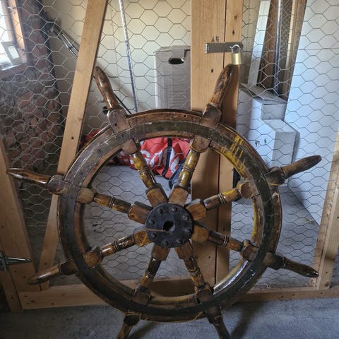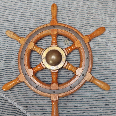 Puusta ja metallista valmistettu ruori. Keskikuppi mukana.
