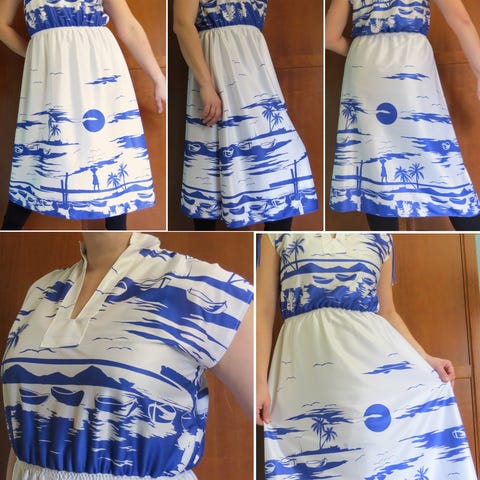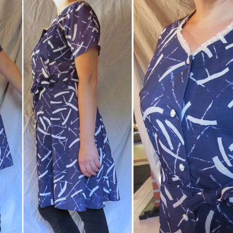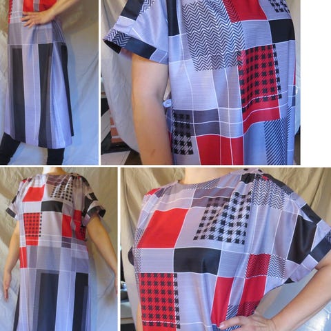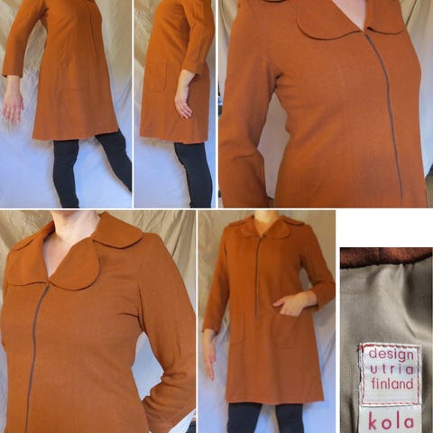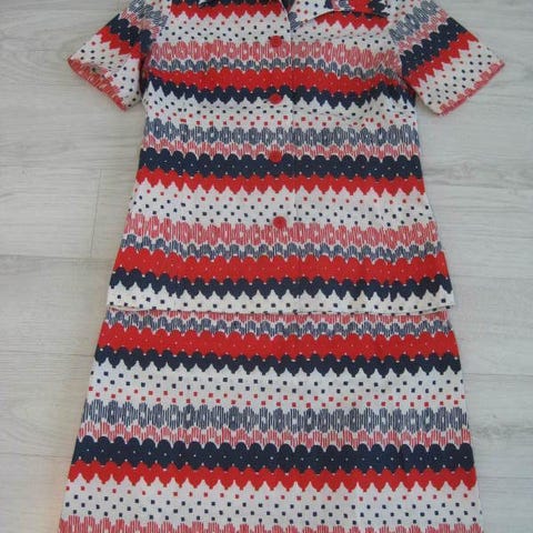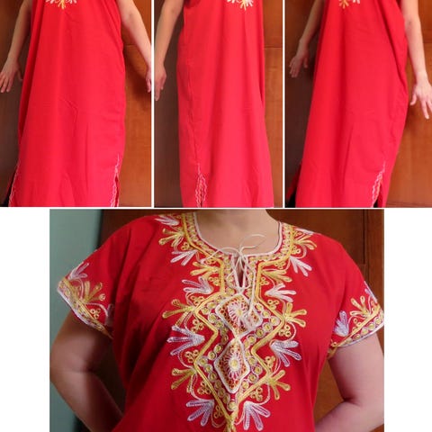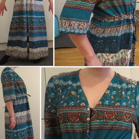 Musta punakukkainen kaftaanimekko 70-luvun alkupuolelta. 3/4osahihat, voimakkaasti levenevä, A-linjainen helma. Pinnalta sileää ja kiiltävää, nätisti laskeutuvaa ja aika painavaa tekokuitua. Koko M-XL, RY n.100cm, VY n.198cm, LY ei juuri väliä. Kunto hyvä, ei kellerviä kainaloita tai muita klassikoita. Hinta 18 euroa + pk:t 8,90 euroa.
