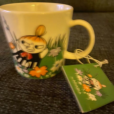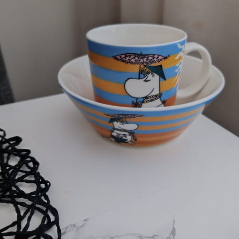 Arabia Muumi kulho ja muki, joissa on värikäs rantaelämää-aiheinen kuosi. Astiat ovat valmistettu kestävästä posliinista. Mukit ja kulhot sopivat arkikäyttöön ja keräilyyn. Tuotteet ovat suunniteltu Suomessa.