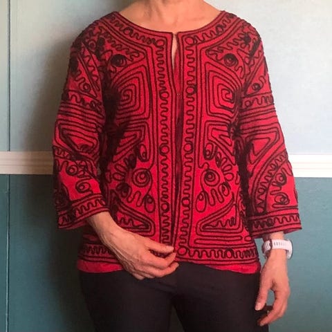 Myydään siistikuntoinen L koon trikoopaita hapsuhihoilla Tallinn Dolls-merkiltä. Kai-kai 53 cm. Kangas joustavaa trikoota.
