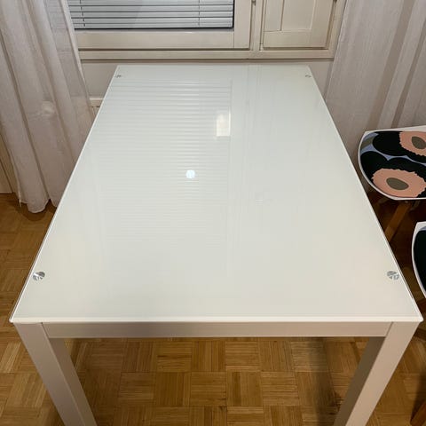 Pieniä kolhuja jaloissa ja pöytälevyn reunassa, jotka näkee tarkemmalla tarkastelulla. Päällisin puolin hyvin siistissä kunnossa.