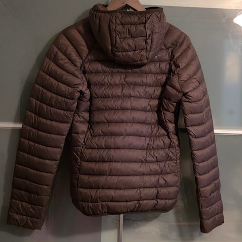 Kahvi ruskea, taskut, ohut huppu kauluksen sisällä, vetoketju, nepparit ja hienot napit. Nouda Lahdesta.
