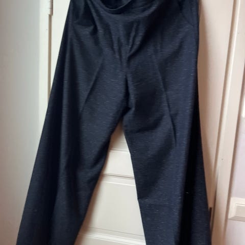 Puuvillasekoitetta, ei jousta, edessä vetoketjutaskut ja lahkeissa vetoketjulla avattavat halkiot. Vyötärö edestä n. 40 cm, haara-lahje n. 72 cm.
