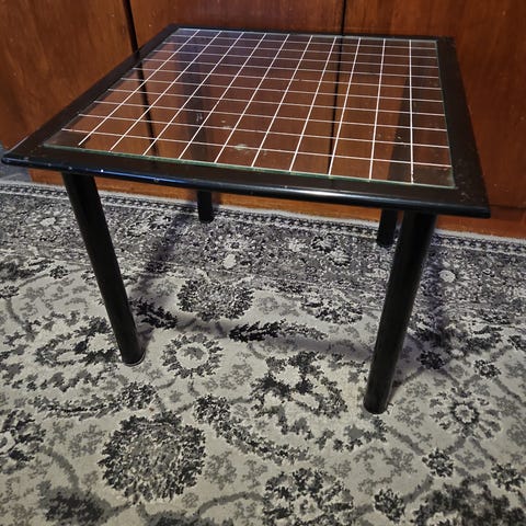 Pöytä hyvässä kunnossa. Lasi on kirkas ja naarmuton ja jalatkin siistit ilman huomattavia jälkiä.