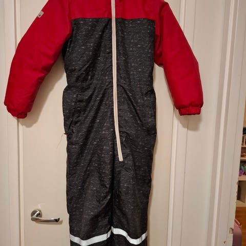 lasten takki ja housut, koko 130. Takki on punainen ja housut mustat. Takki on valmistettu kevyestä materiaalista, jossa on vetoketju ja huppu. Housuissa on heijastin.