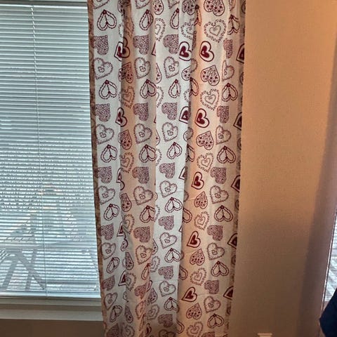 Kuin uusi, käyttämättömäksi jäänyt jouluverho-asetelma: kappa ja sivuverhot, nauhat