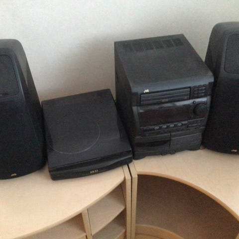 JVC ja Philips laitteita lasi ovisessa ja lasi kantisessa räkissä EI kovaäänisiä. Ylimääräisenä yksi levysoitin. Toimivina varastoitu vuosia sitten. Tästä retroa kotiin tai tallille!
