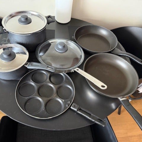 Sekalainen setti monenmoista tarpeellista. Enemmän tai vähemmän käytettyjä, mutta kaikki käyttökelpoisia. En ole nyt enää myöskään putsaillut näitä. Merkkejä kuten KN, Heirol, Hackman sekä merkittömiä. Mukaan myös käyttämätön tinakauha uudenvuoden aatolle, tässä säilytyksen tuomaa jälkeä myös ja pieniä tummumia - voi tämän keittiössä toki ottaa muuhunkin käyttöön :)