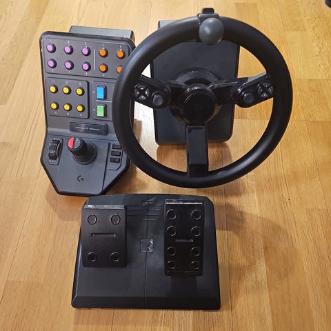 Logitech saitekin Farming Simulator -peliin kuuluva ratti-poljin-sivupaneeli setti. Toimii myös esimerkiksi Euro Truck Simulator 2 pelin kanssa.