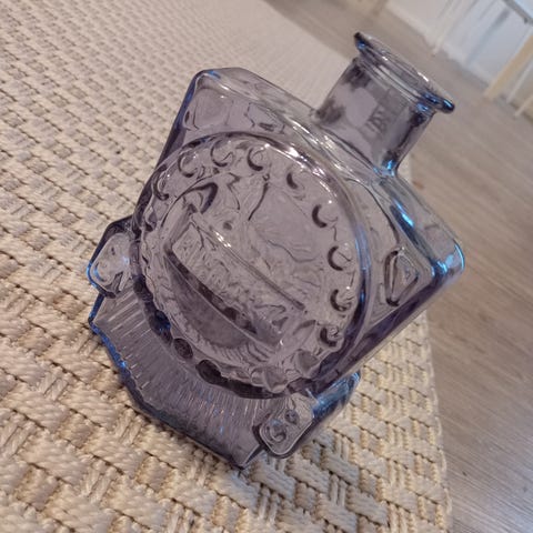 Riihimäen lasin Veturipullo, väri kirkas. Suunnittelija Erkkitapio Siiroinen. Korkeus 13,5 cm, leveys 10 cm. Pullon kaulassa tarra.