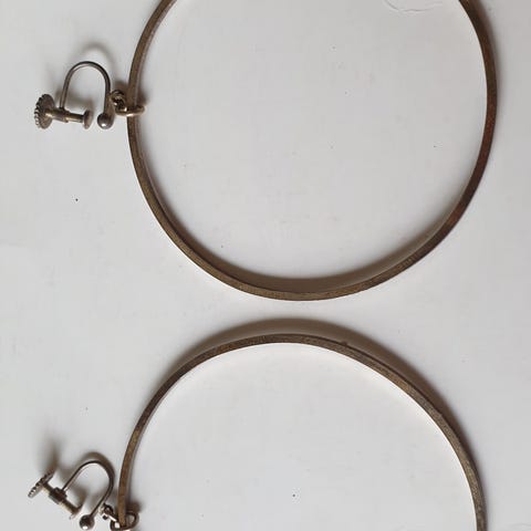 Suurehkot korvakorut. Sisäosan halkaisija noin 28 mm. Leveys noin 10 mm alaosasta, kapeampi ylhäältä. Hopeiset tai hopeoidut, ei leimoja. Ajanpatinaa.