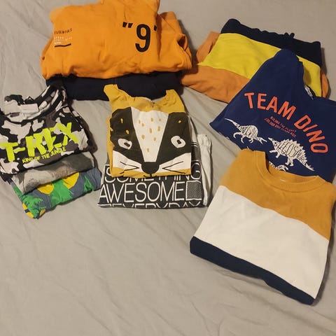 Huom: hirviöprinttipaidassa kangas hieman nukkaantunut, muuten kaikki siistejä ja ehjiä