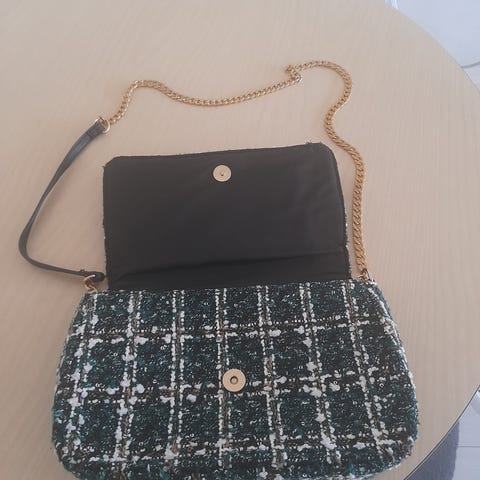 Vetoketjulla suljettava kaksilokeroinen käsilaukku/iltalaukku. Lusäksi sisällä vetoketjulka suljettava tasku. Ulkopuolella vetoketjulla suljettava tasku. Hihna säädettävä.