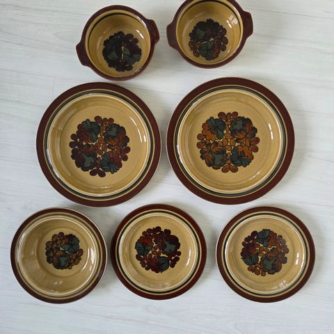 Arabian Otso-sarjaa. Sarjan on suunnitellut Ulla Procopé (S-malli) ja kuvioinnin Raija Uosikkinen Otso on ollut tuotannossa vuosina 1975–1978. Kaikki osat ehjiä. Kulumaa eniten tasseissa. Kuvioinneissa värivaihtelua. Kermakon lasite epätasainen.