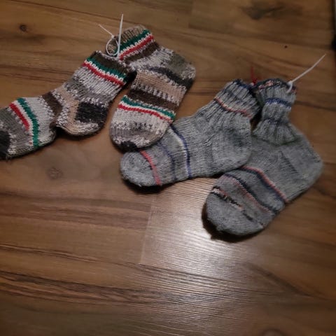 Kaksi paria villasukkia. Koko kantapäästä kärkeen 17cm.