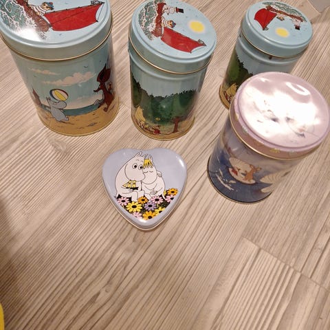 Muumitalo peltipurkki, uusi, käyttämätön, kork 16cm+katto ja halk. 14cm. Hinta kappale.