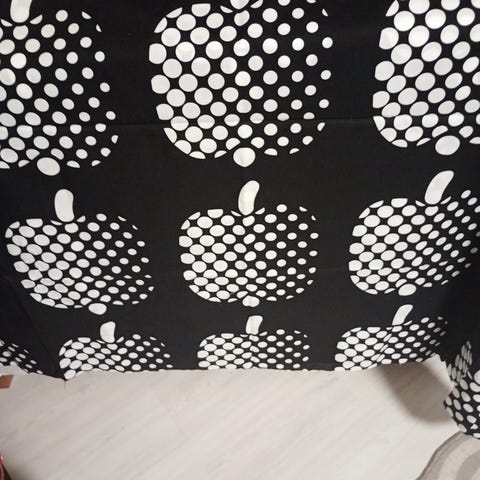 Finlaysonin Optinen omena -kangasta. Paksua puuvillaa. Kuosin on suunnitellut Pirkko Hammarberg vuonna 1973.