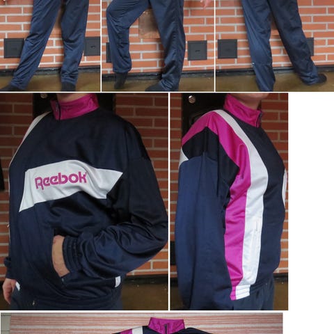 90-luvun verkkapuku - juuri sitä pinnalta sliipatunsileää ja liukasta, kääntöpuolelta nukkaista tekokuitua. Varmaan olisi hyvä kelluntapukukin, on meinaan niin muovista kangasta ei varmasti vety läpi ihan heti. Vetoketju edessä, lepakkohihamainen väljä malli. Koko L/XL, RY 145cm, VY 124cm, pituus 75-80cm. Housuissa VY venyttämättä n. 88cm, joustaa reilusti, näissä se standardimallinen kuminauhallinen resorikuja. Kunto mainio, ei tahroja tai kulumia.