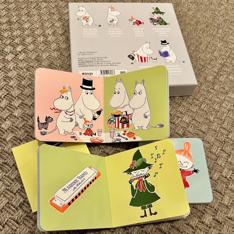 Kirja ehjä, siisti ja töhrimätön. Mukaan saa kuvassa olevat muumihahmot.