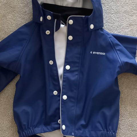 Everest -merkin sadetakki, vetoketjulla + napit, koko 98/104. Väri vaalea, kunnossa ei moitetta, toki arka väri, edessä tahra.