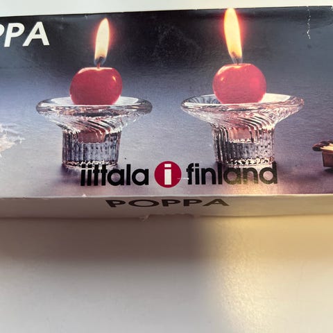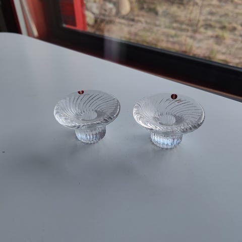 Iittala Poppa-kynttilänjalat, kaksi kappaletta, kirkasta lasia, suunnittelija Valto Kokko, valmistettu Suomessa, alkuperäisessä laatikossa, käyttämättömät.