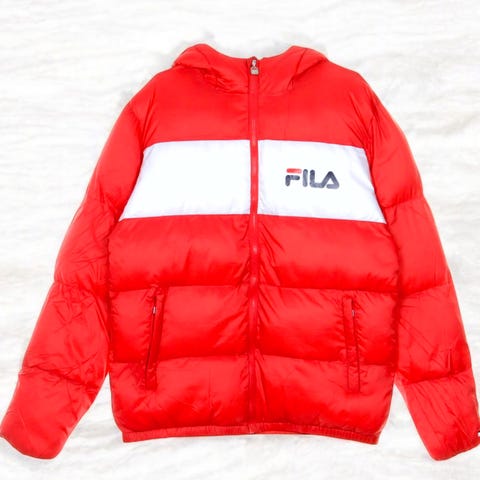Fila M takki keltaisella värillä. Takki on miesten kokoinen ja soveltuu ulkoiluun. Materiaalitiedot löytyvät tuotetarrasta.
