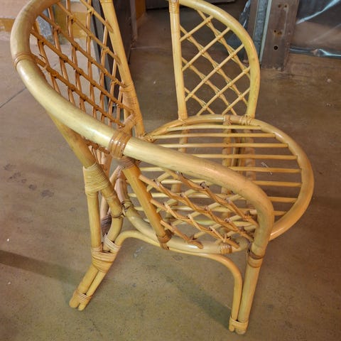 Hyväkuntoinen rottinkikalusto sohva, kaksi tuolia, pöytä.