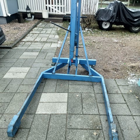 Punainen hydraulinen tunkki, joka on suunniteltu ajoneuvojen nostamiseen. Tunkissa on pitkä vipu ja pyörät helppoa liikuttelua varten. Materiaali on metallia, ja se soveltuu käytettäväksi erilaisissa korjaus- ja huoltotöissä.